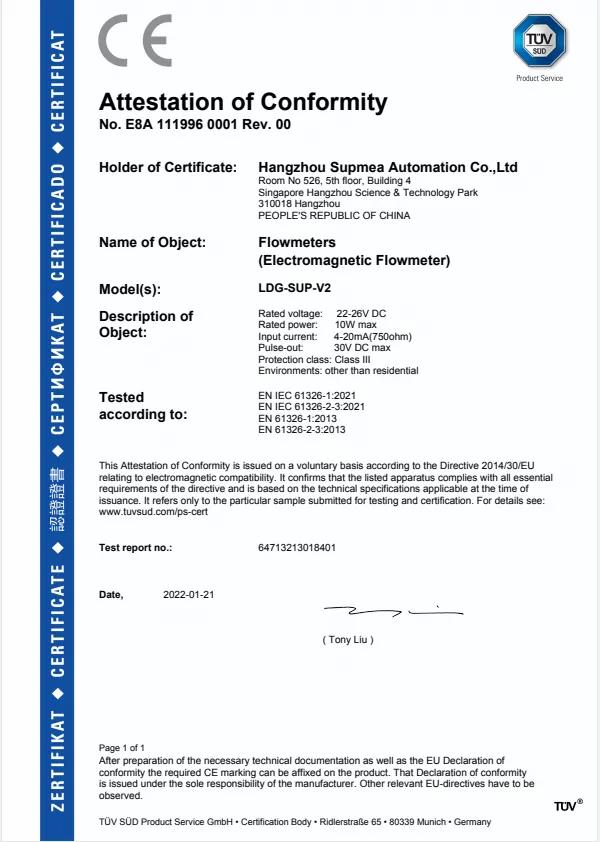 近日,美儀核心產品電磁流量計榮獲國際頂級檢測機構TüV南德意志集團頒發的CE認證證書。