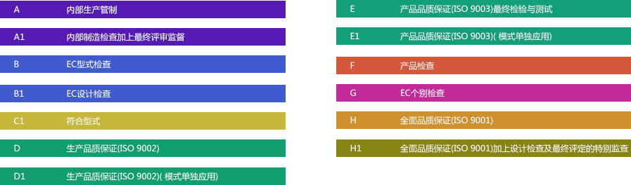 其中,模式A不必經由驗證機構驗證,其余各模式則都要經歐盟會員國認可指定的驗證機構(notified body)驗證。